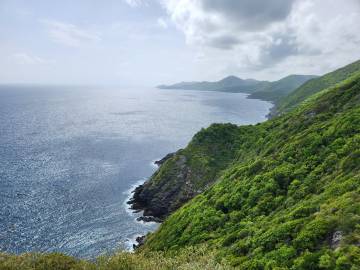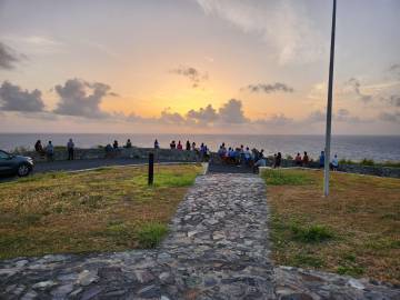 We woke up obscenely early this morning and hit the rough Cruzan roads by 4:30 AM to make our way to Point Udall, the easternmost spot in the United States, to catch the sunrise. It took us every bit of the hour we had allotted, and we arrived just in time to join the crowd of 50 or so other people who had gathered there before us to watch the sun make its way up, emerge above the horizon, and eventually break through the clouds. After we had done this “thing you’re supposed to do in the place you’re supposed to do it” we headed back toward Christiansted in search of breakfast. We were initially puzzled that many of the breakfast spots that had come recommended in Scott’s research weren’t open until we remembered that today was a holiday: it was Juneteenth. We eventually found a breakfast spot in downtown Christiansted that was open and sat outside on their patio and had breakfast before returning back to Fredriksted for me to teach.