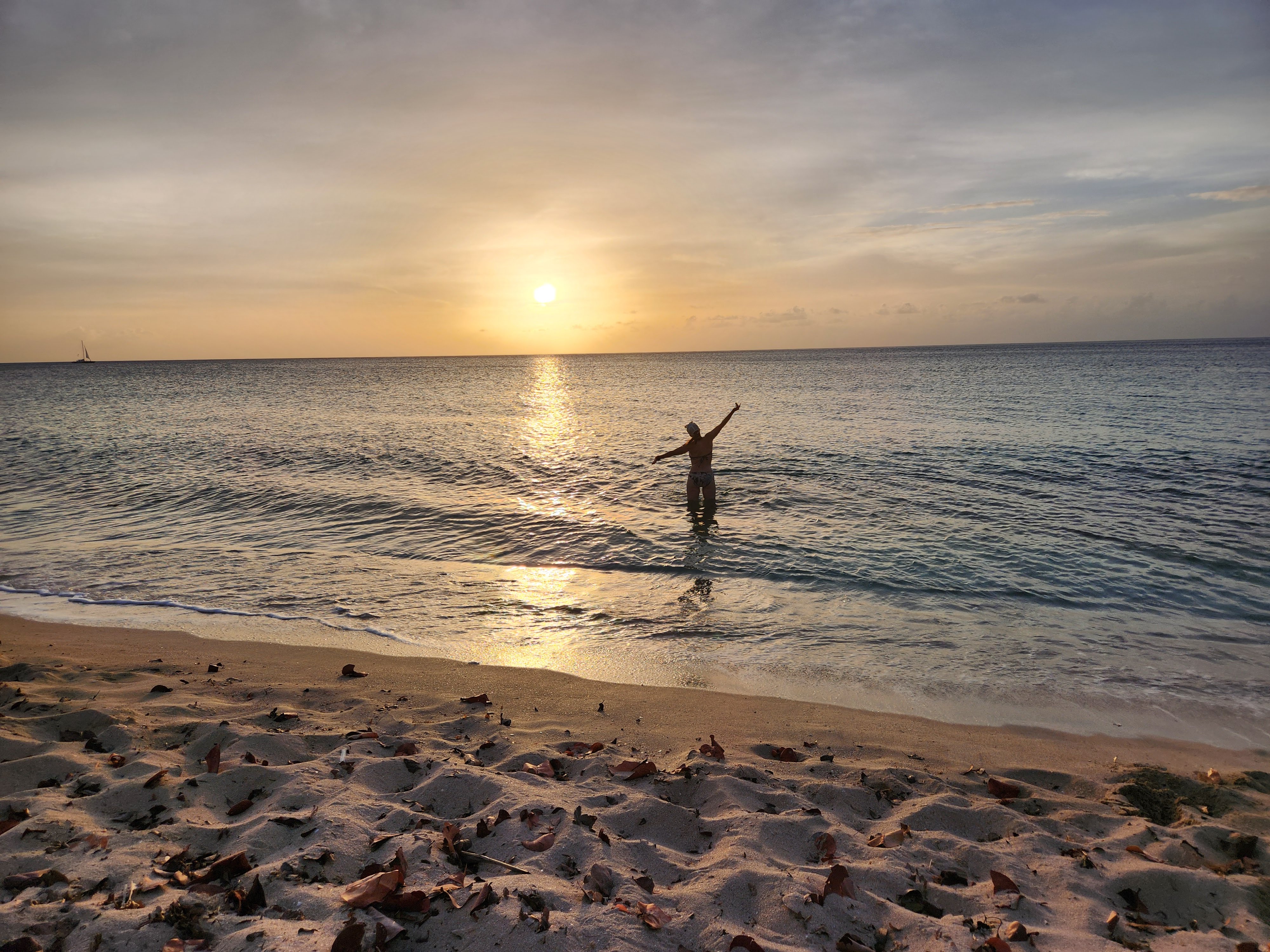When I was somewhat cross-eyed from my glass search and my back was starting to complain from being crouched over, I headed back to the hammock where Scott had positioned himself. He poured me some of our Cruzan pina colada mix and we enjoyed watching families celebrating their holiday at the beach, swimming and picnicking. From our hammock we bore witness to the sunset over the Caribbean, the day made special by having said both “hello” and “goodbye” to the celestial body around which our planet revolves before we called it a day and headed back to Hilltop House.