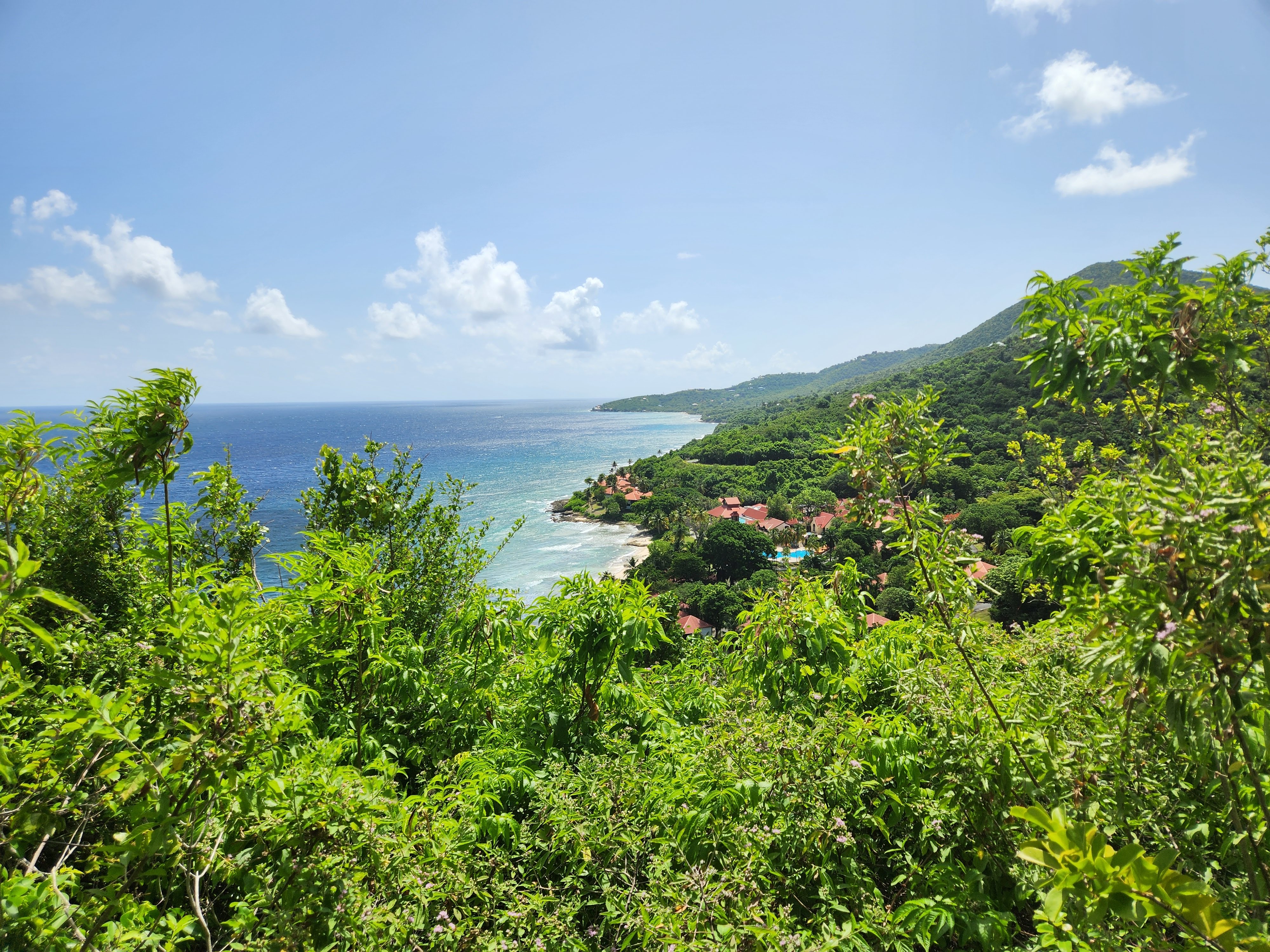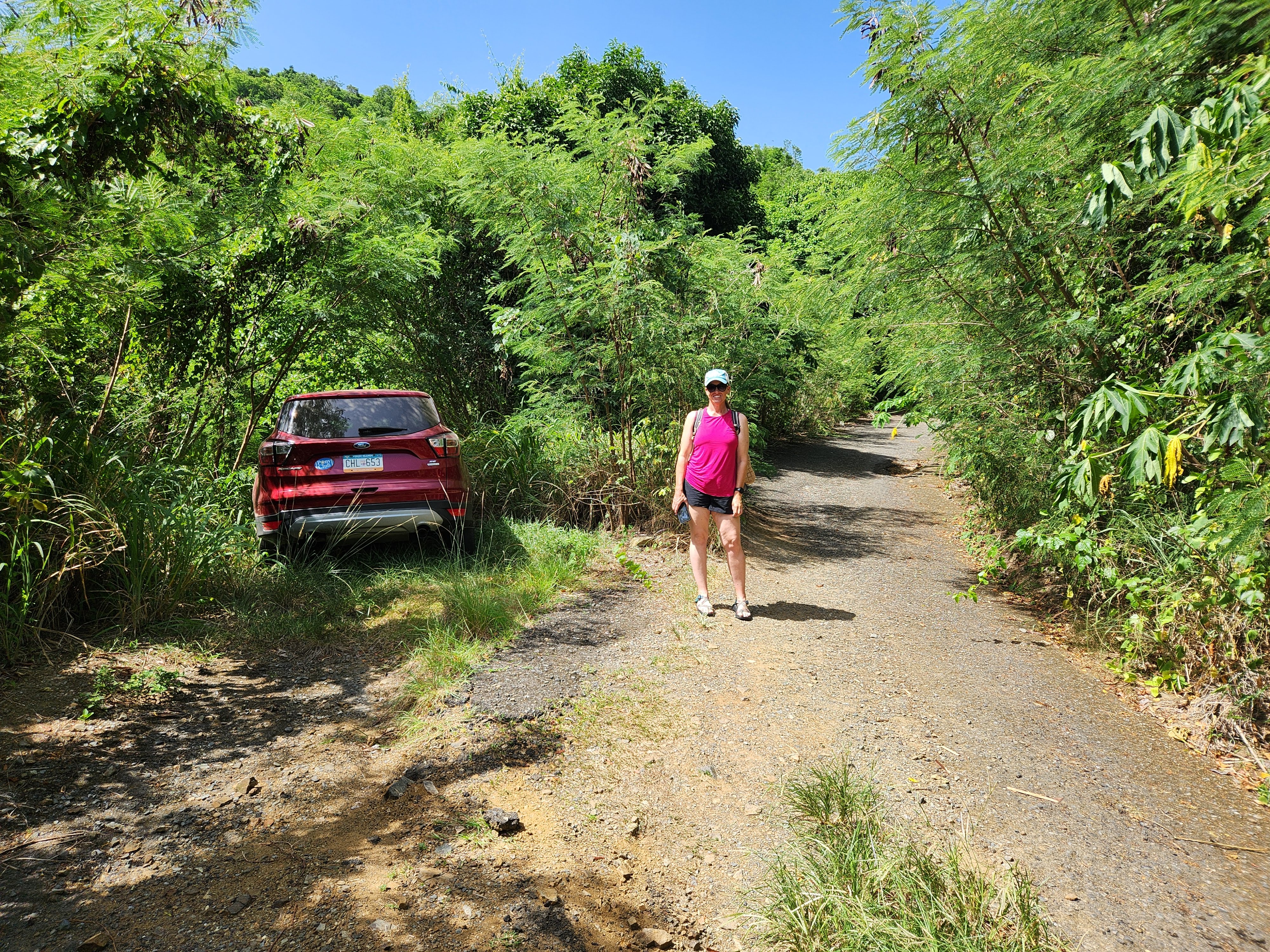A guard at the gated entrance of the Carambola Beach Resort laid out our parking options when we arrived at the trailhead to the tidal pool hike. None of them were ideal but Scott did a good job nimbly and carefully navigating Miss Bettye’s Escape into the best of the bad options as we drove up a road better suited to a rugged 4x4, following the guard’s instructions to park in the field that “doesn’t look like it is a parking lot but it is.” We got out and began the two mile hike through the rainforest to the pools.