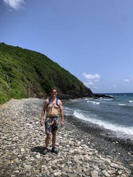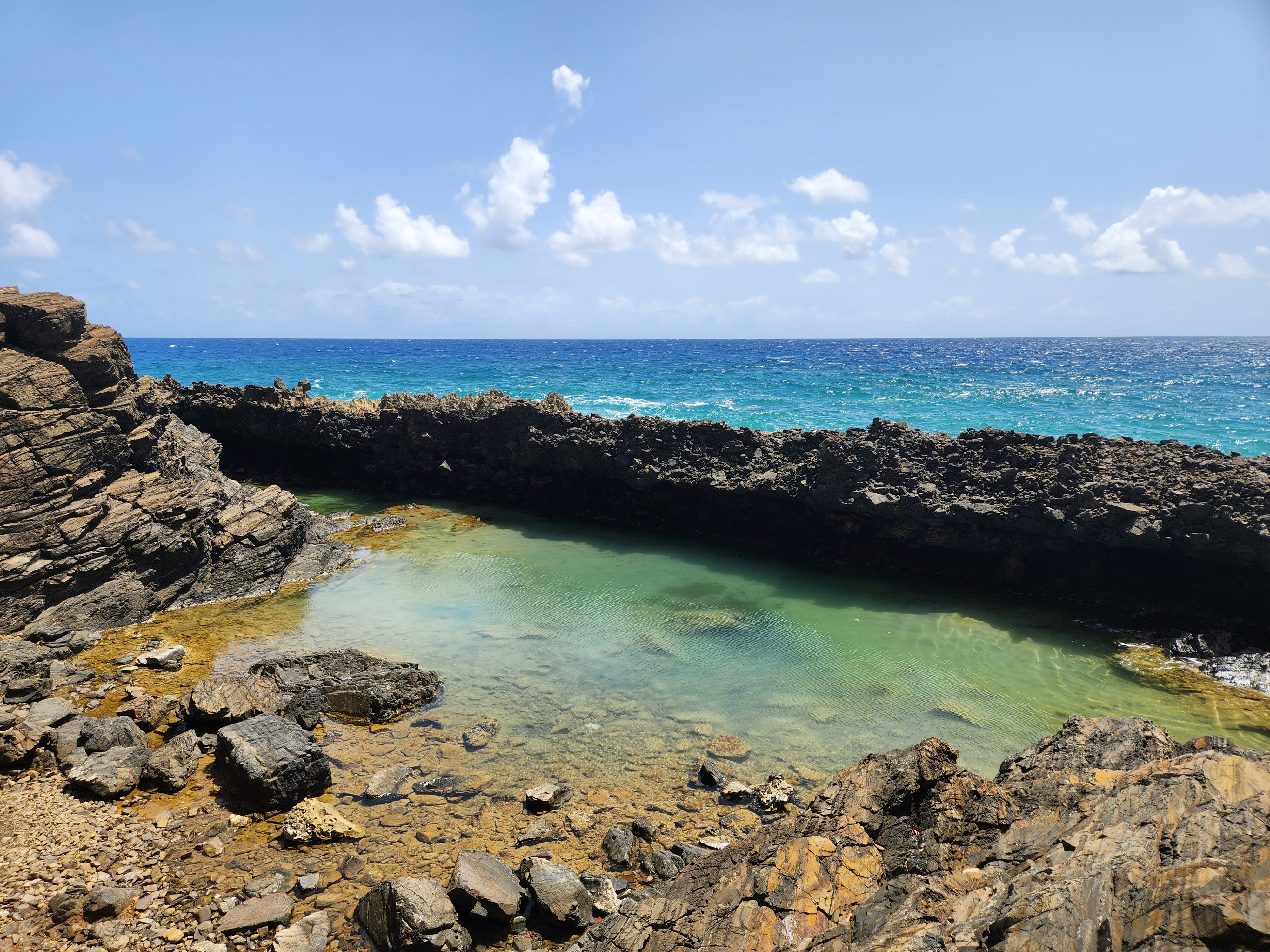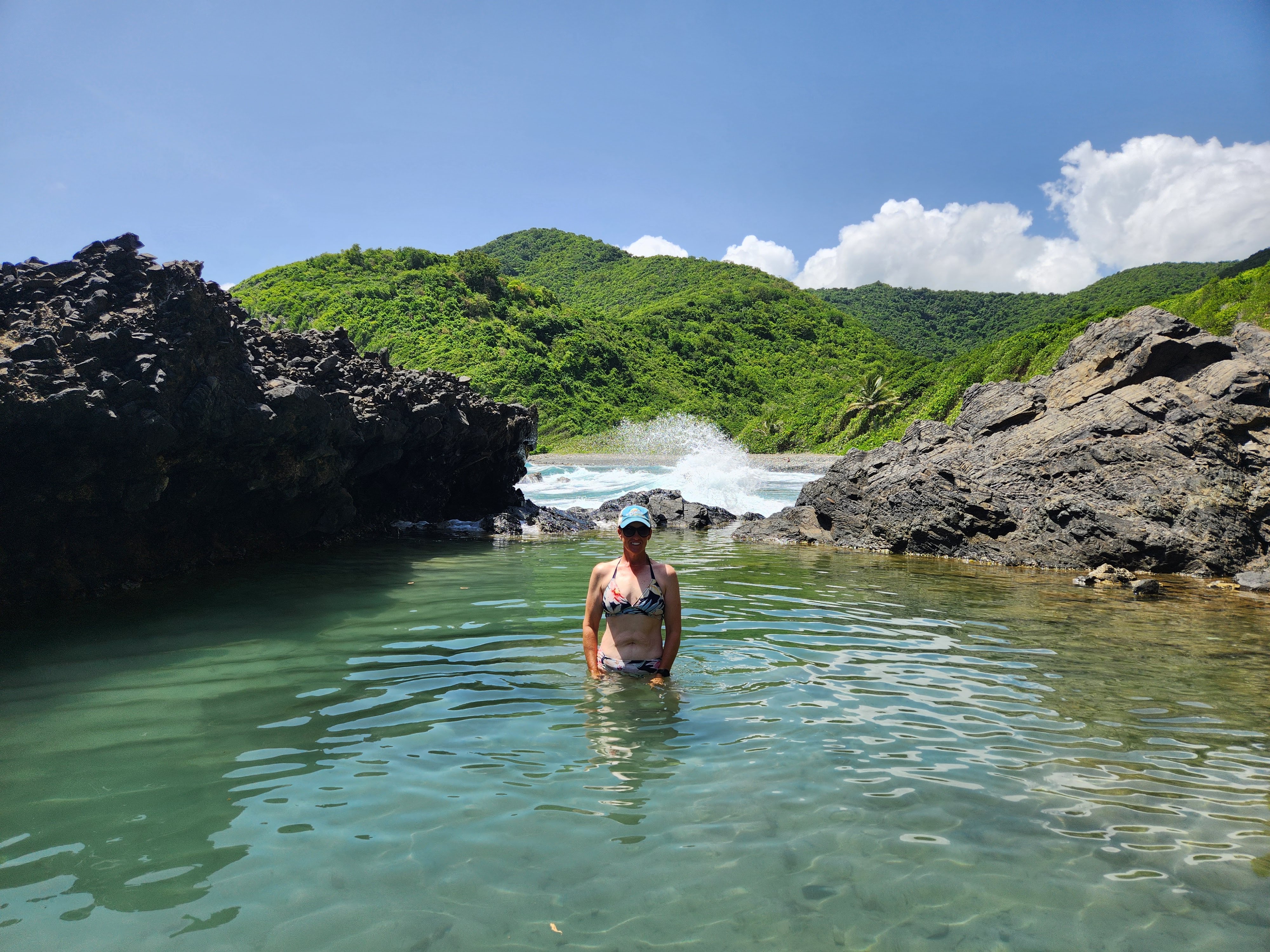 The hike was hot and steep but the views of the Caribbean that we were teased with along the way when the trees would thin enough for us to catch sight of it made us push on. When we finally arrived at the rocky shoreline we were rewarded with stunning views; the mountains rose up around us, the turquoise water before us, and the sound of the surf moving the rocks around as the waves crashed against the shore all around us. We saw some people crawling over rocks a few hundred meters away and figured that was the way to the pools. When we got to the group, they indicated that we were on the right track and we climbed up the rock face and over the giant boulders to reach the first pool.