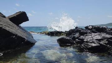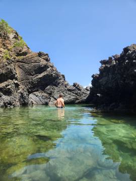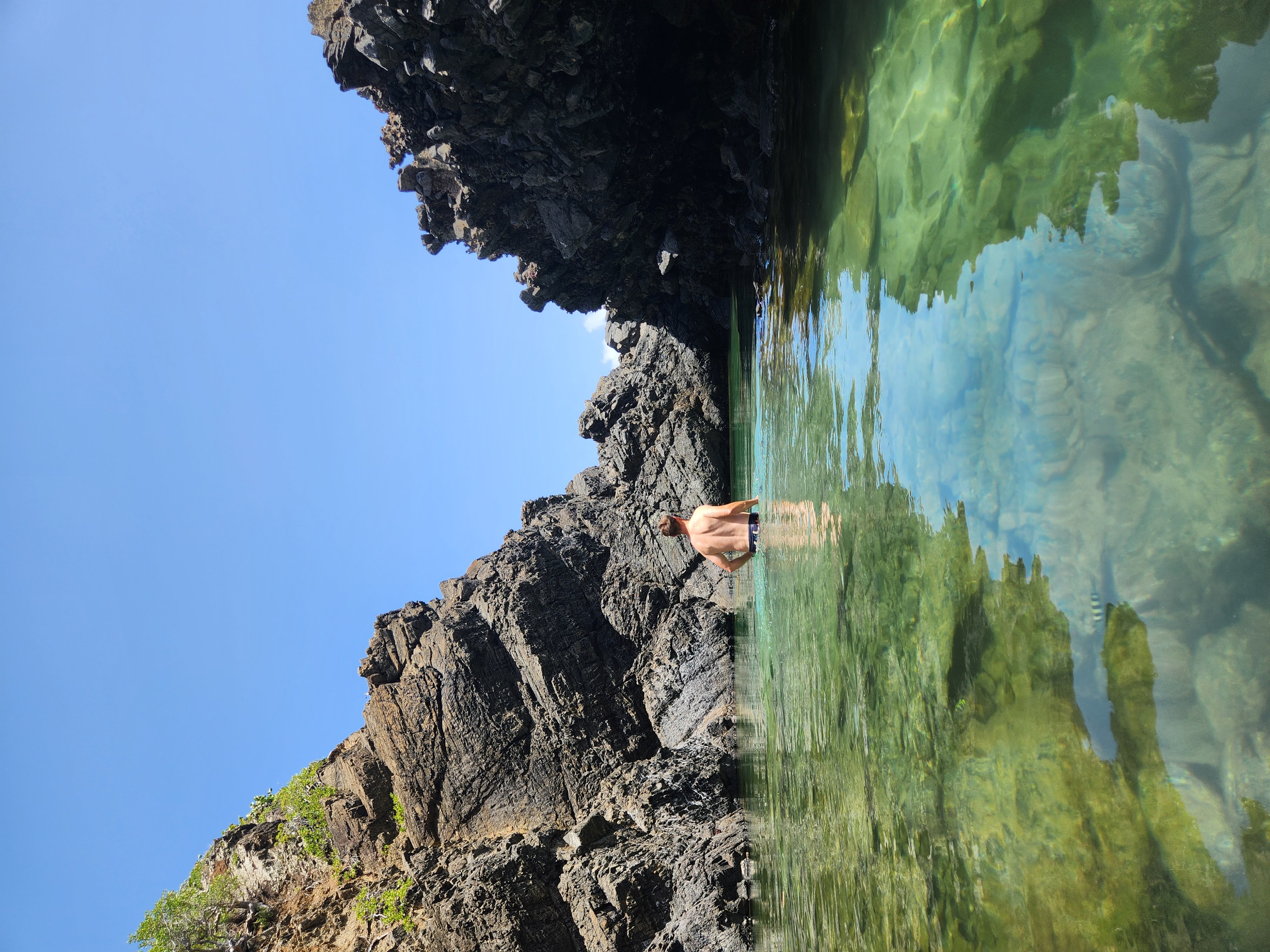 We put our stuff down and stripped to our bathing suits and waded in. We were glad we had kept our shoes on because it was rocky and there were sea urchins perched between rocks that would not feel good to step on. I did end up tangling with one when I put my hand down on an underwater rock to navigate my way through the pool and got pricked, and a few minutes later noticed that the heel of my hand didn’t have any feeling, the sea urchin’s venomous spine had numbed it. After that I was much more careful at scouting for them.