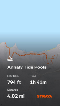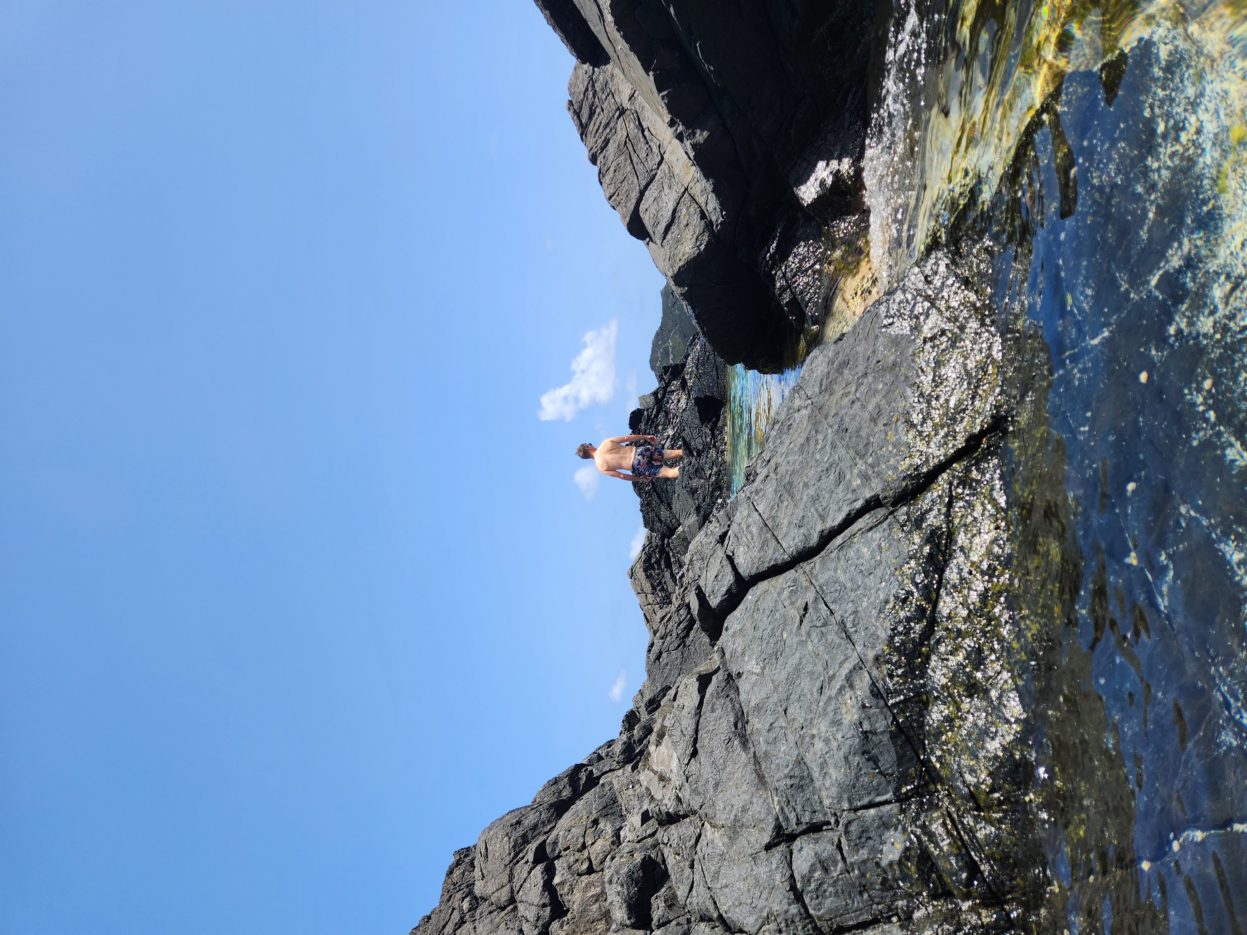 When we were satisfied with our tidal pool exploration we decided to head back to our stuff for lunch. As we retraced our steps I decided that the best way to get back into the final pool was by jumping off the 10 foot rock face rather than trying to climb down and I bravely leapt in and Scott followed. We had lunch sitting on a rock in the first pool taking in the sights around us and watching other people discover the pools. We then packed up and hiked the two miles back out. I took Scott’s advice to wear my sneakers that I had brought just in case my Teva sandals became uncomfortable and was much more surefooted on the hike back out.