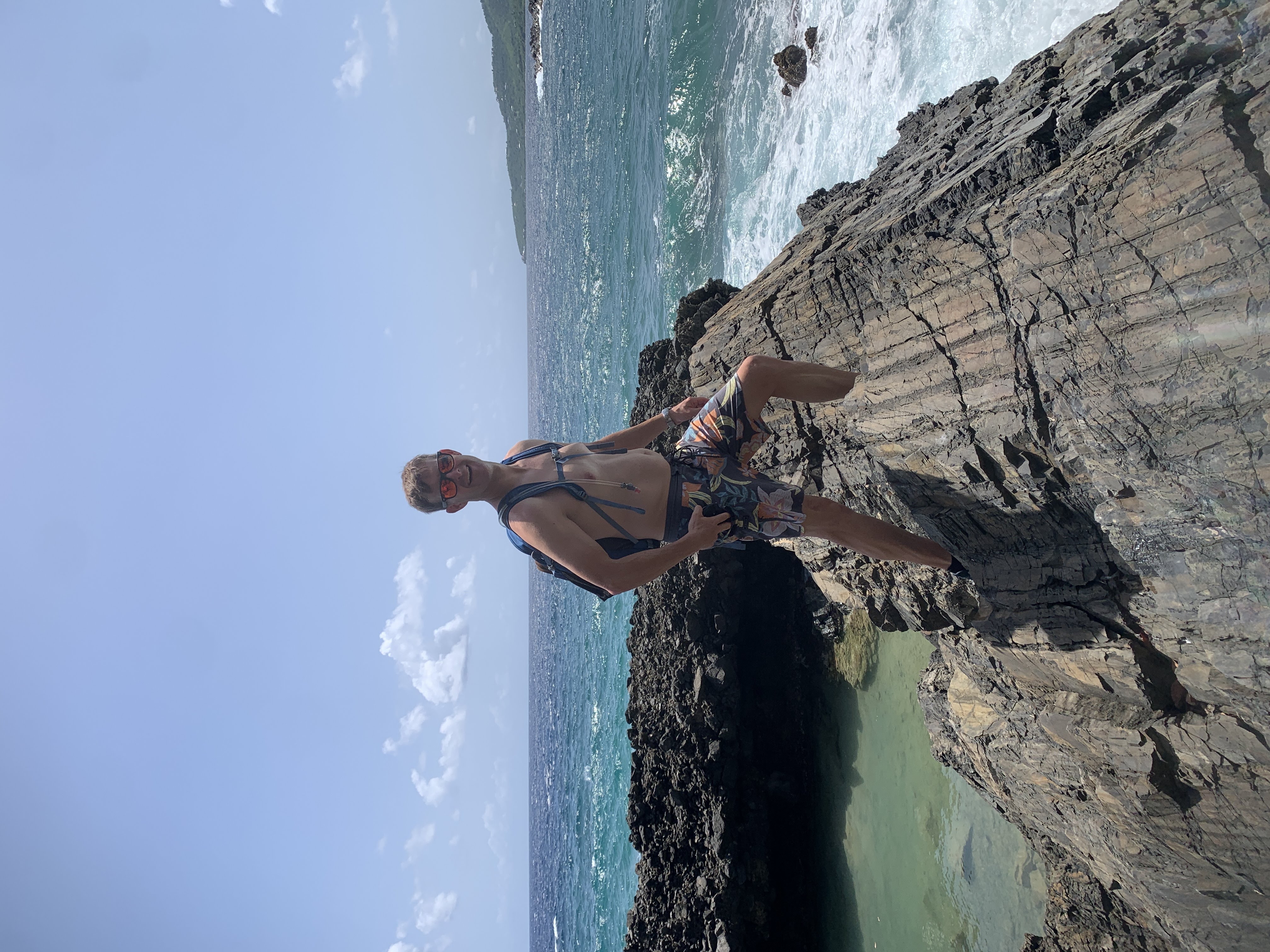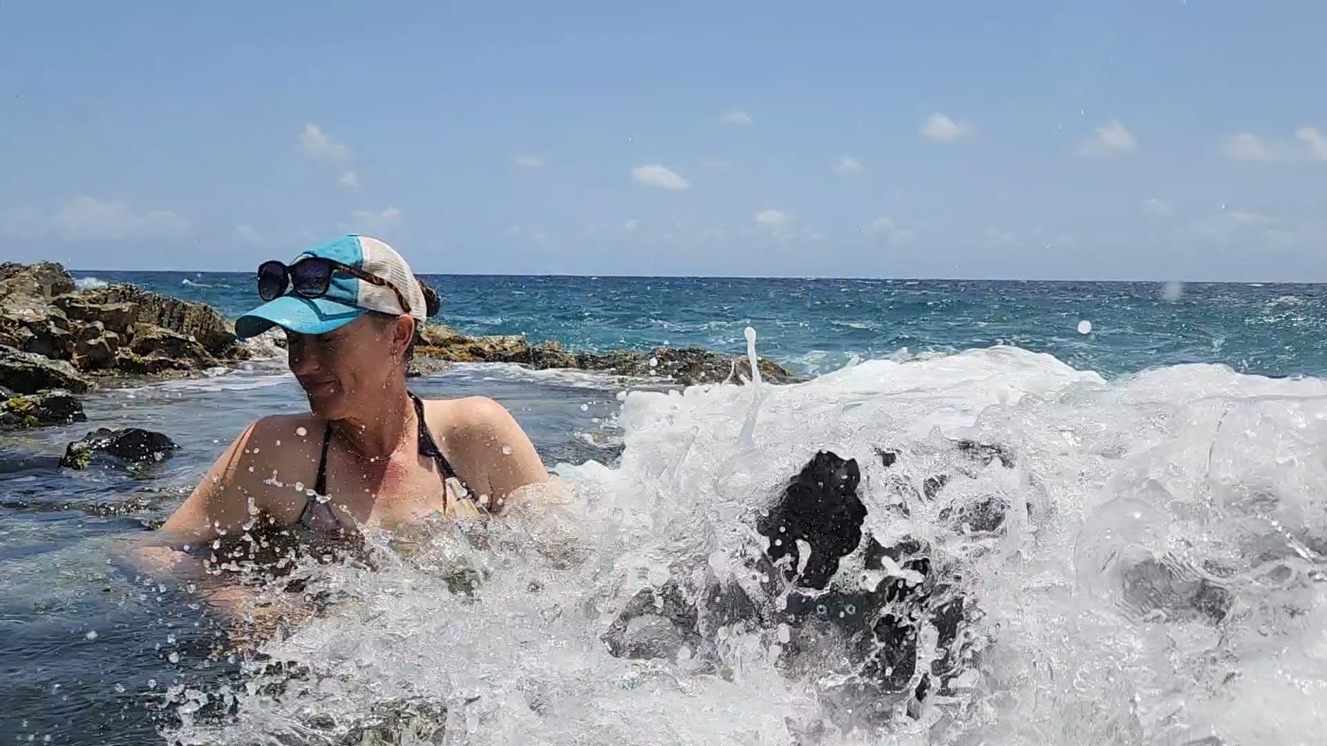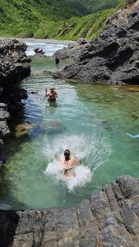 The pools were teeming with aquatic life, a micro-ecosystem at play, and we saw several species of fish and sealife, but luckily didn’t see the venomous sea snakes that some people have reported spotting in the pools. We enjoyed swimming and exploring and made our way to each of the pools in the series. We stopped at one that had the most clear opening to the sea and sat on the boulders and periodically got soaked by waves as they crashed against the rocks spraying surf that rose up several meters into the air and deposited more water into the pools. It was reminiscent of our trip to the Queen’s Bath in the Mokes in Oahu.