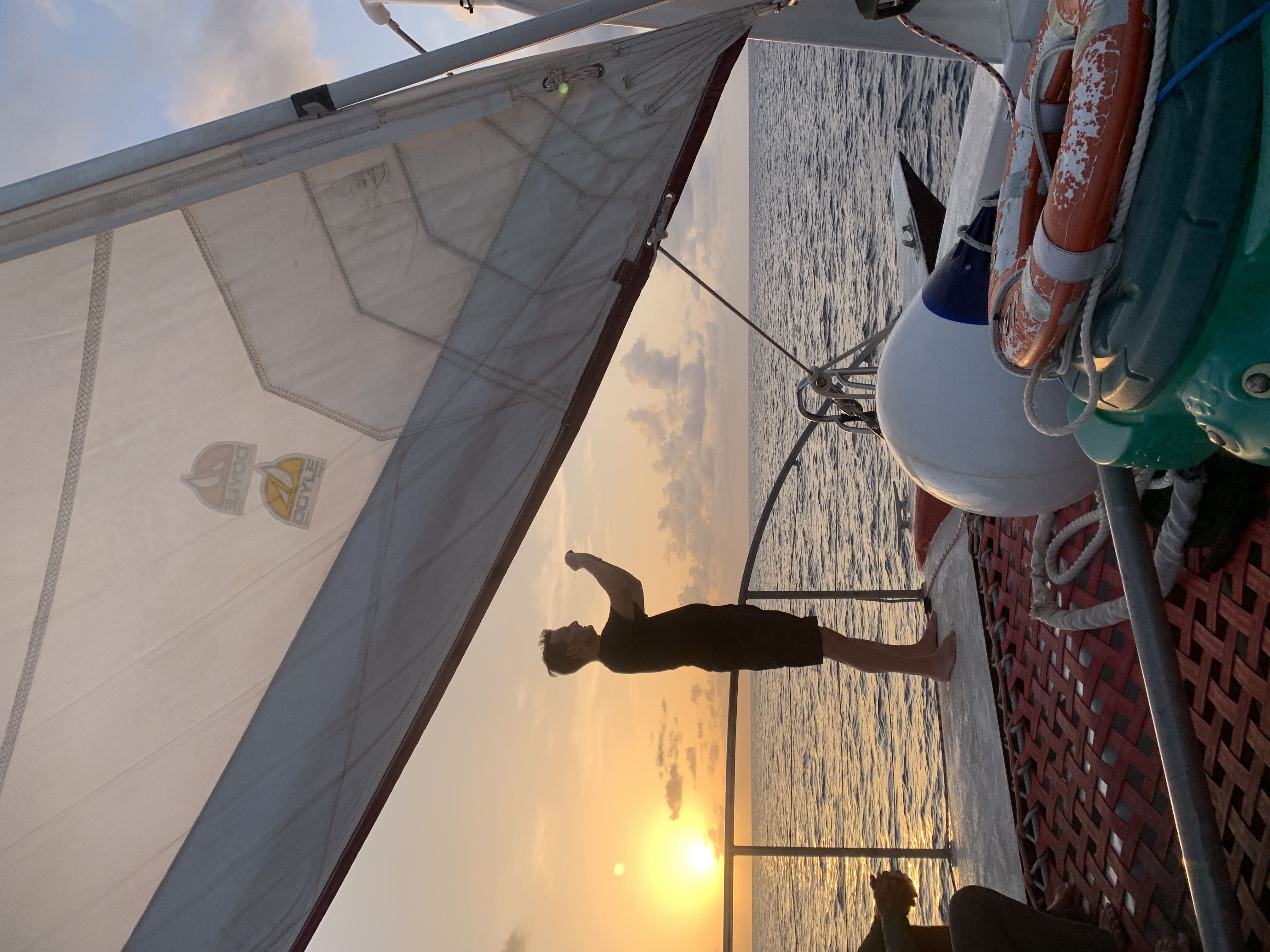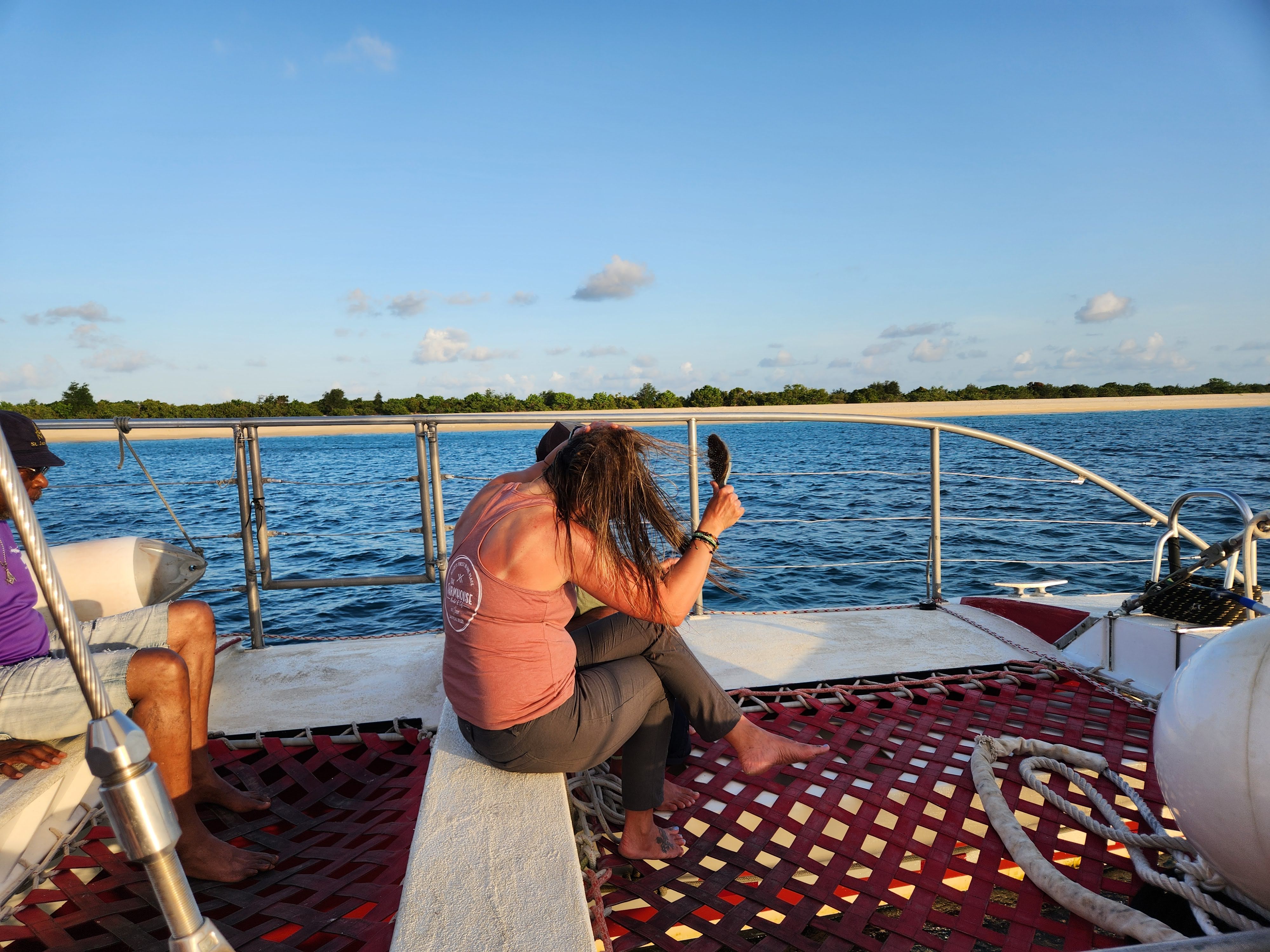 We boarded and grabbed seats at the front near the catamaran’s trampolines (the nets at the front). While waiting to board, we had noticed a woman furiously hacking away at the biggest rat’s nest of a tangle on her head with a hairbush, and now she sat a few feet away from us, still hacking away, making seemingly zero progress. We found this a little odd and guessed that eventually she would stop once we set sail. Nope. She continued to attack the snarl throughout the entire cruise. We finally pieced together that she had been snorkeling with her hair loose and this is how she got the impossible tangle. She battled it so ferociously that eventually the captain of the boat came to offer her some sort of detangler or hair oil, which although she accepted, seemed to do little to convince it to let go. I imagine her back home almost a month later still working on this thing.