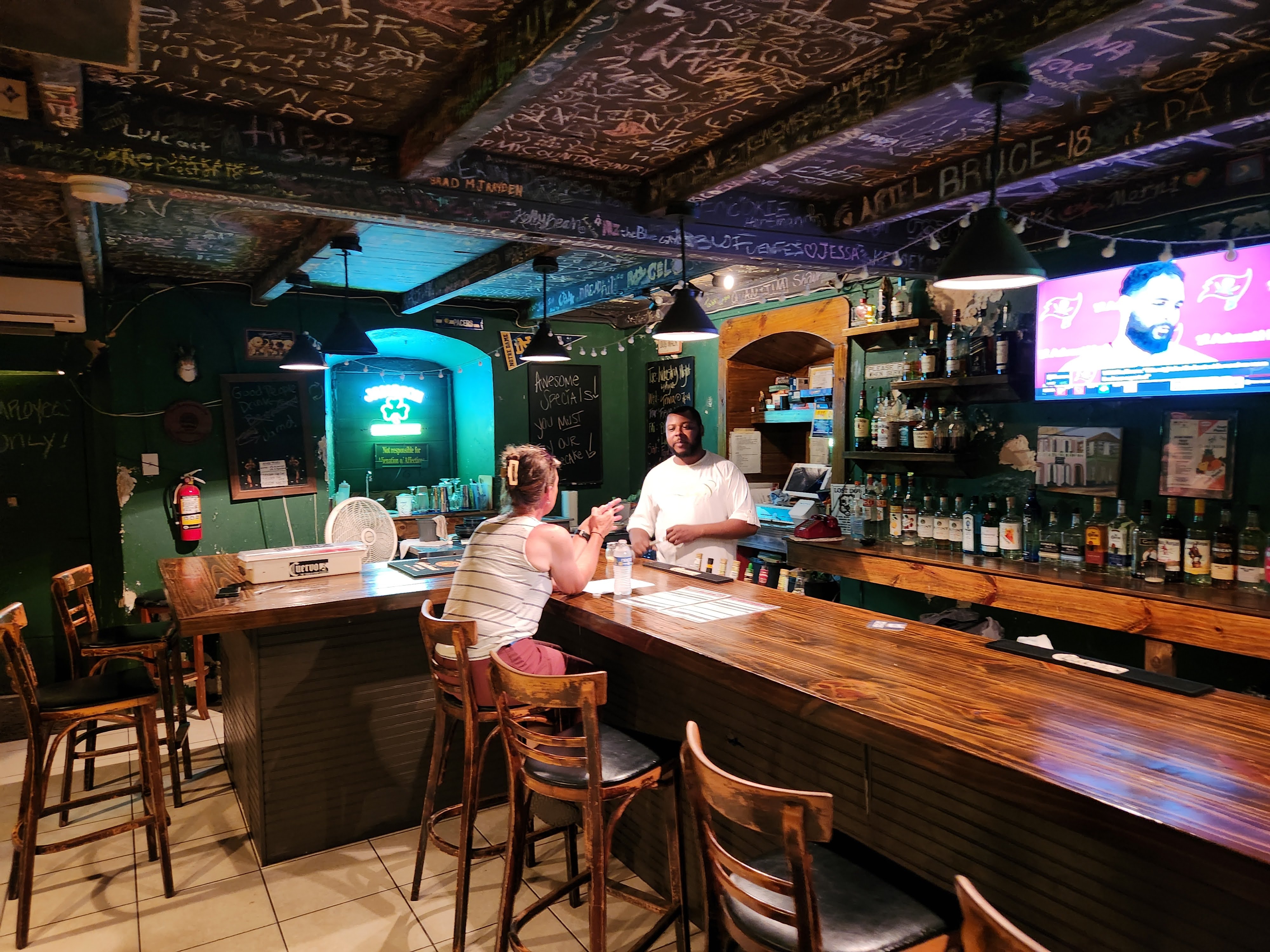 And then sadly we were back at the pier and the cruise was over. We decided to walk across the street into town to find some dinner, taking the suggestion that our server from the previous night’s dinner had offered of The Lost Dog, a dive bar nearby. Three-rum-punch Janna is very chatty and I proceeded to chat up the bartender, who as it turns out, is probably the most traveled human being that Scott and I have ever encountered, having been to over 40 countries. He entertained us with tales of his travels as Scott and I shared a pizza. Other locals came and went and I may or may not have inquired about their life stories as well. (I am glad Scott doesn’t get tired of my obnoxiousness.)