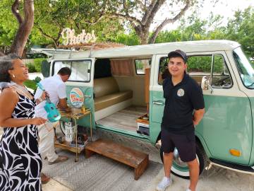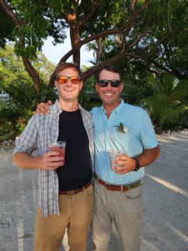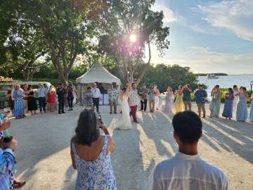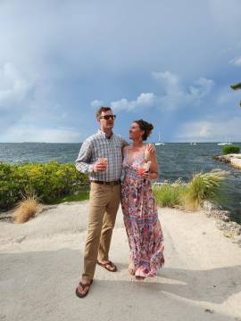 We arrived fairly early to the wedding venue, The Key Largo Lighthouse Beach, so we had some time to walk around and admire the property and its waterfront views. They had picked the most idyllic spot to get married. Holly was a beautiful bride and her brother Gus served as the officiant and was his typical goofy self which was perfect. I cried happy tears as she and Bradley said their vows. Holly’s brother-in-law was in charge of FaceTiming Holly’s father who unfortunately was not able to travel to the wedding due to an emergency abdominal surgery a few days prior. They kept the ceremony short and sweet and then we were sent to the pre-reception cocktail hour that featured a tiki-hut bar right on the water.