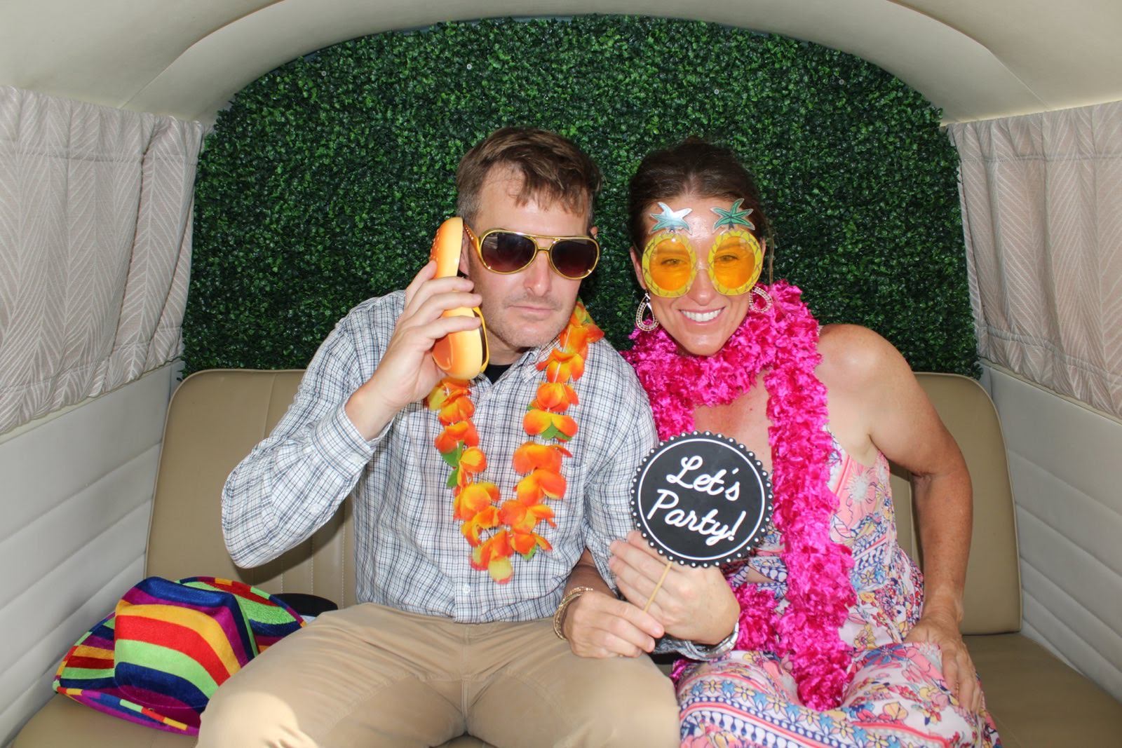 Scott and I were tickled to see that they had a photobooth, and not just any photobooth, but a fully restored 70’s model Volkswagen bus that was stocked full of all sorts of over the top accessories and props. We made a beeline to it, picked out our kitschy attire from the selection, and hopped in for the first of three sessions. Not to brag, but we are basically photobooth experts and take ridiculously ridiculous pictures and love every minute. (Fun fact, Scott is using the picture below with me cropped out as his work profile picture now and I think someone has commented on it in every single meeting this week- it has created many laughs and is so incredibly on-brand for him.)
