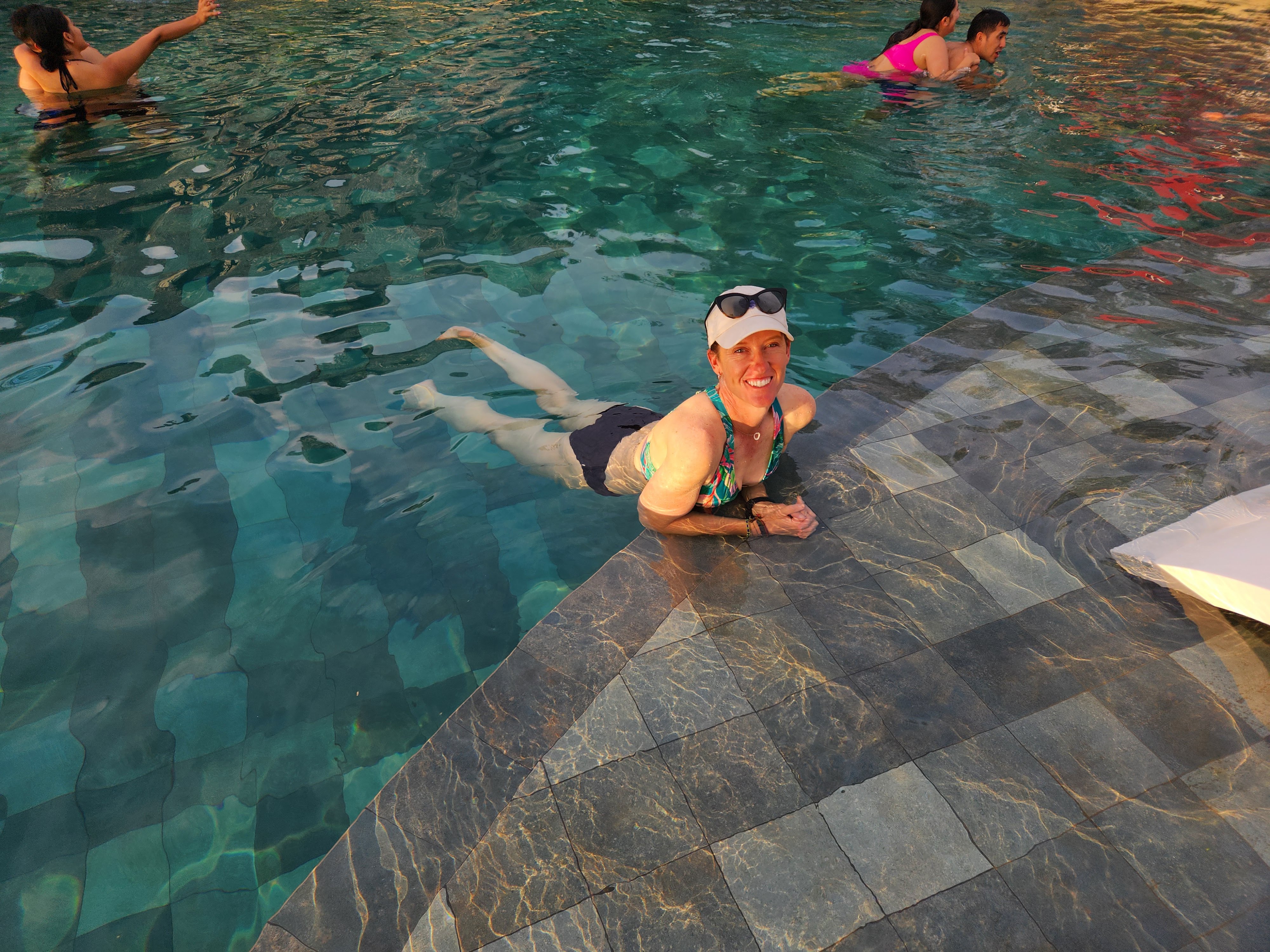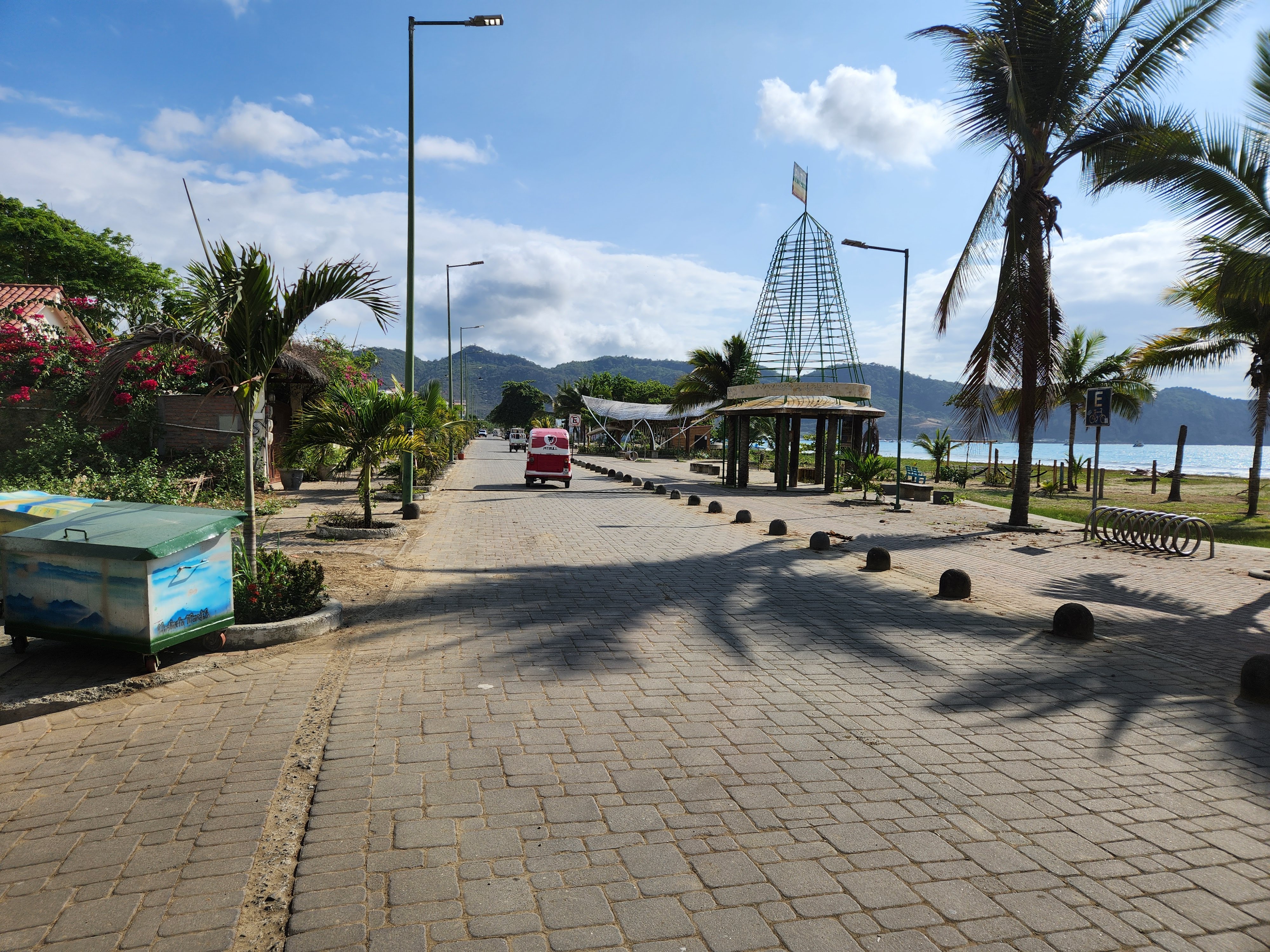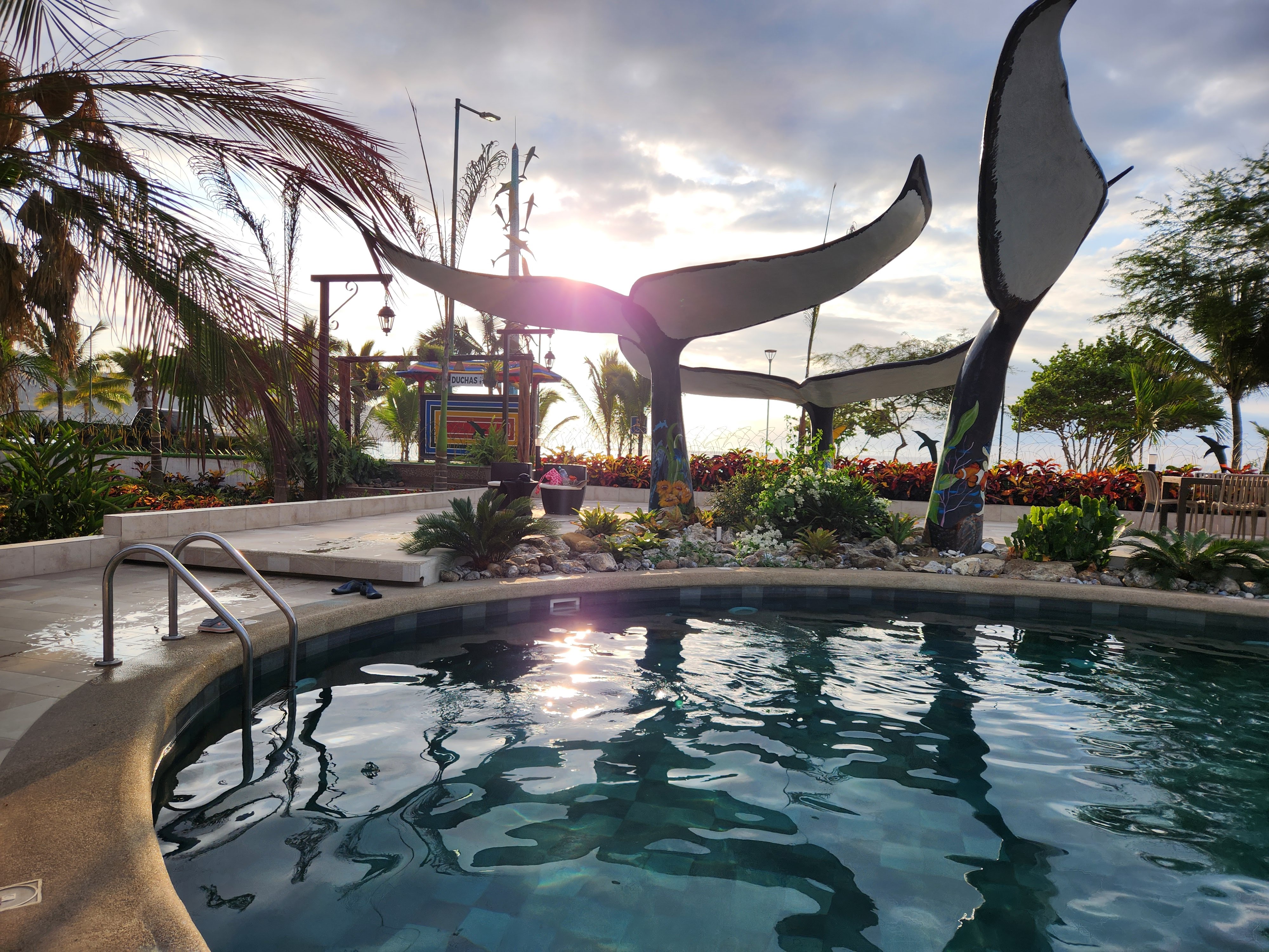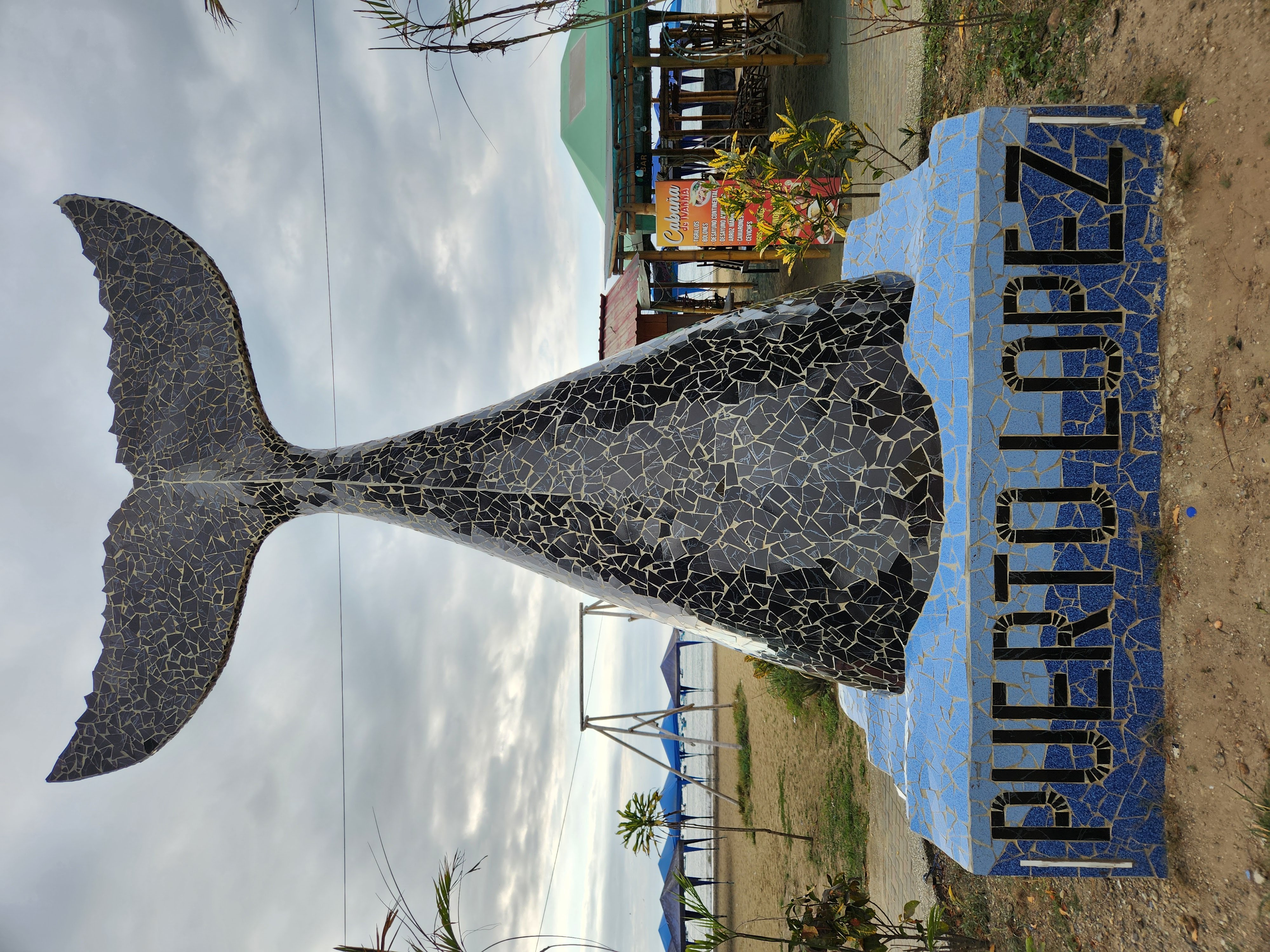 We changed into our bathing suits and headed down to investigate the beach. This stretch of shoreline that this part of Puerto Lopez and our hotel sat on reminded me of Koh Lanta in Thailand, with the curve of the shore and the mountains book-ending each side of the cove. We walked for a bit and enjoyed seeing the various humpback whale sculptures, placards, and displays- Puerto Lopez is located in the ideal spot for watching them during their migration season (June to October) and the area serves as a nursery for them where they come to birth their calves. Unfortunately we were out of this season so there would be no whale watching for us.