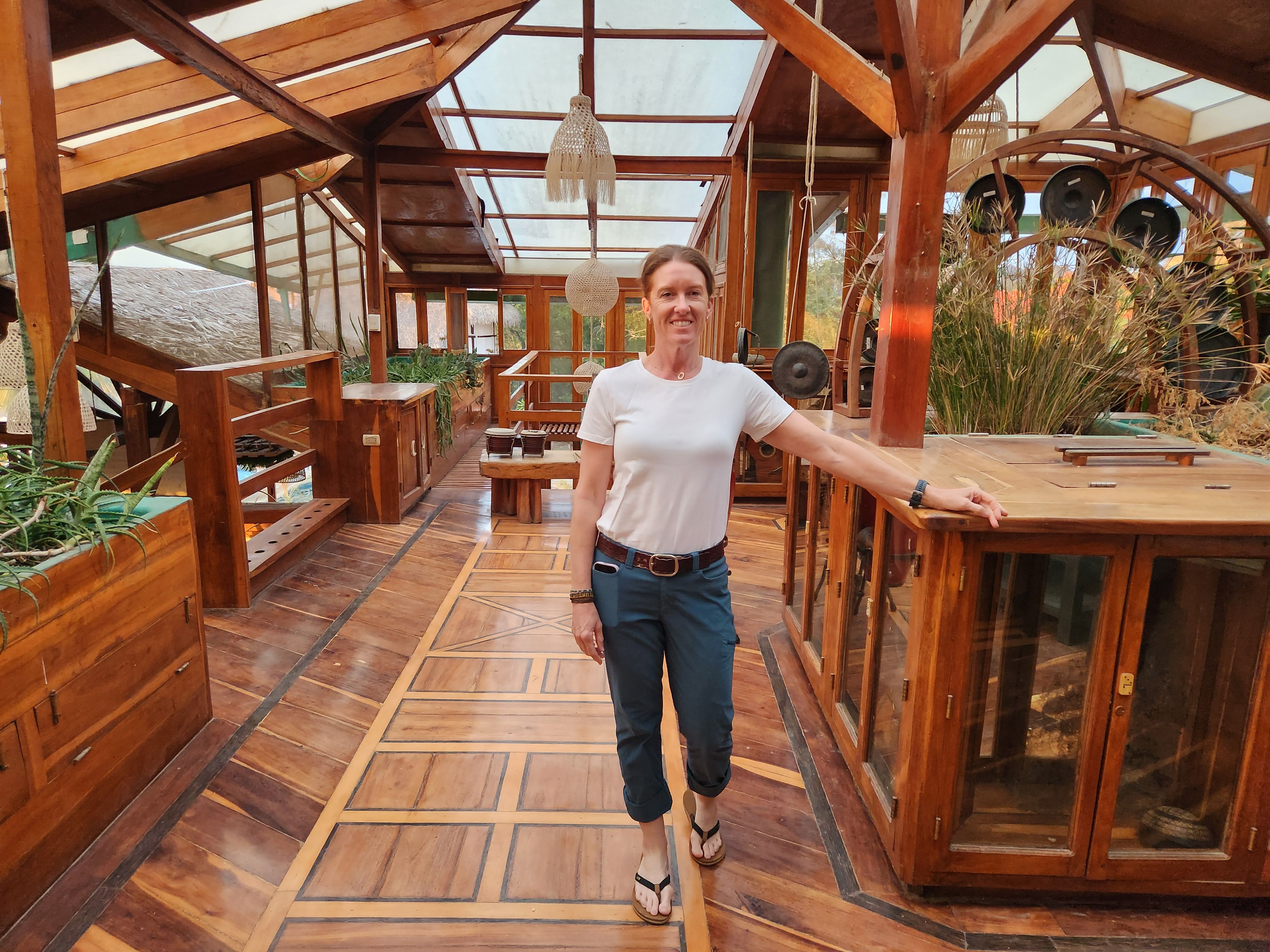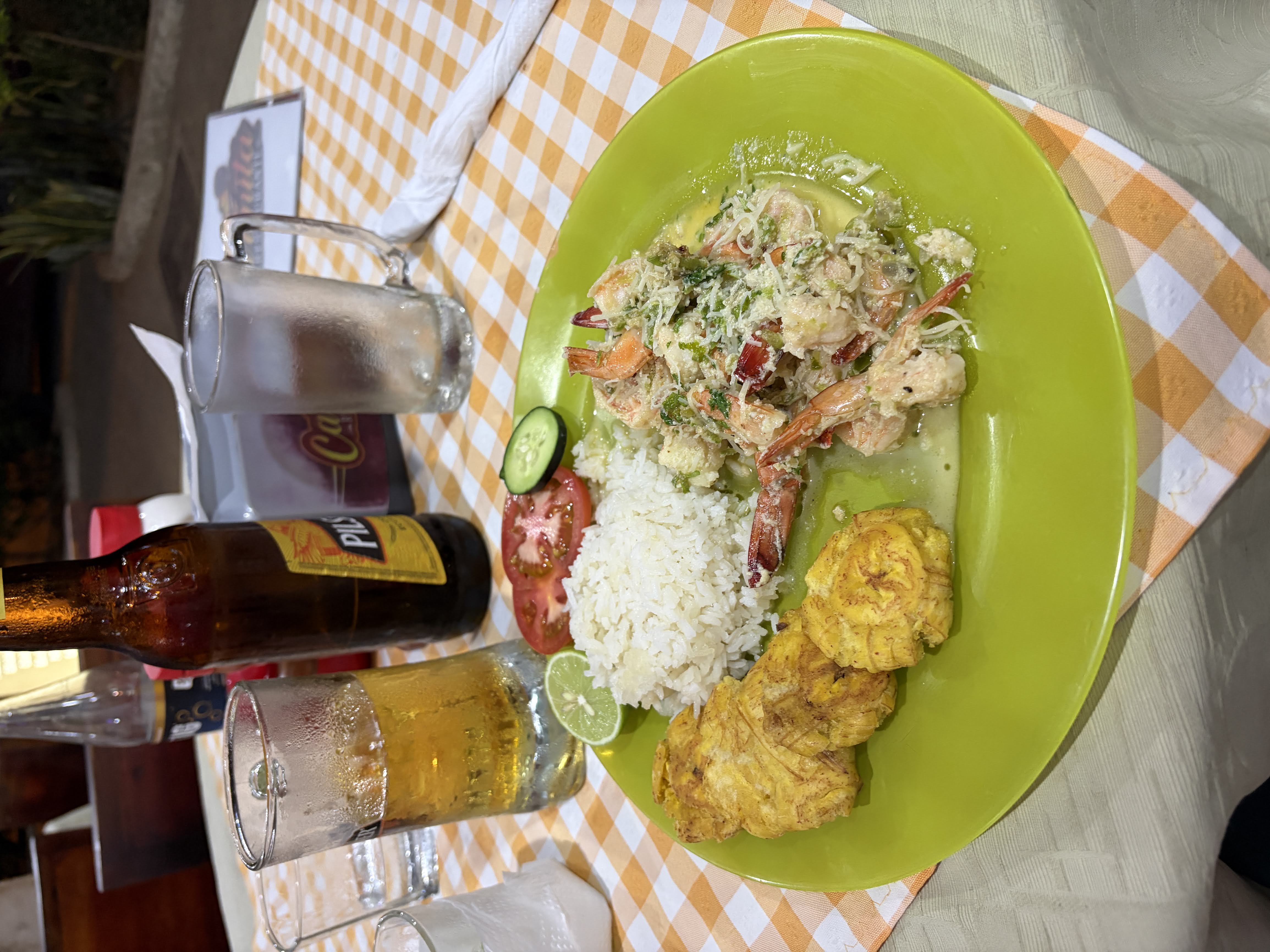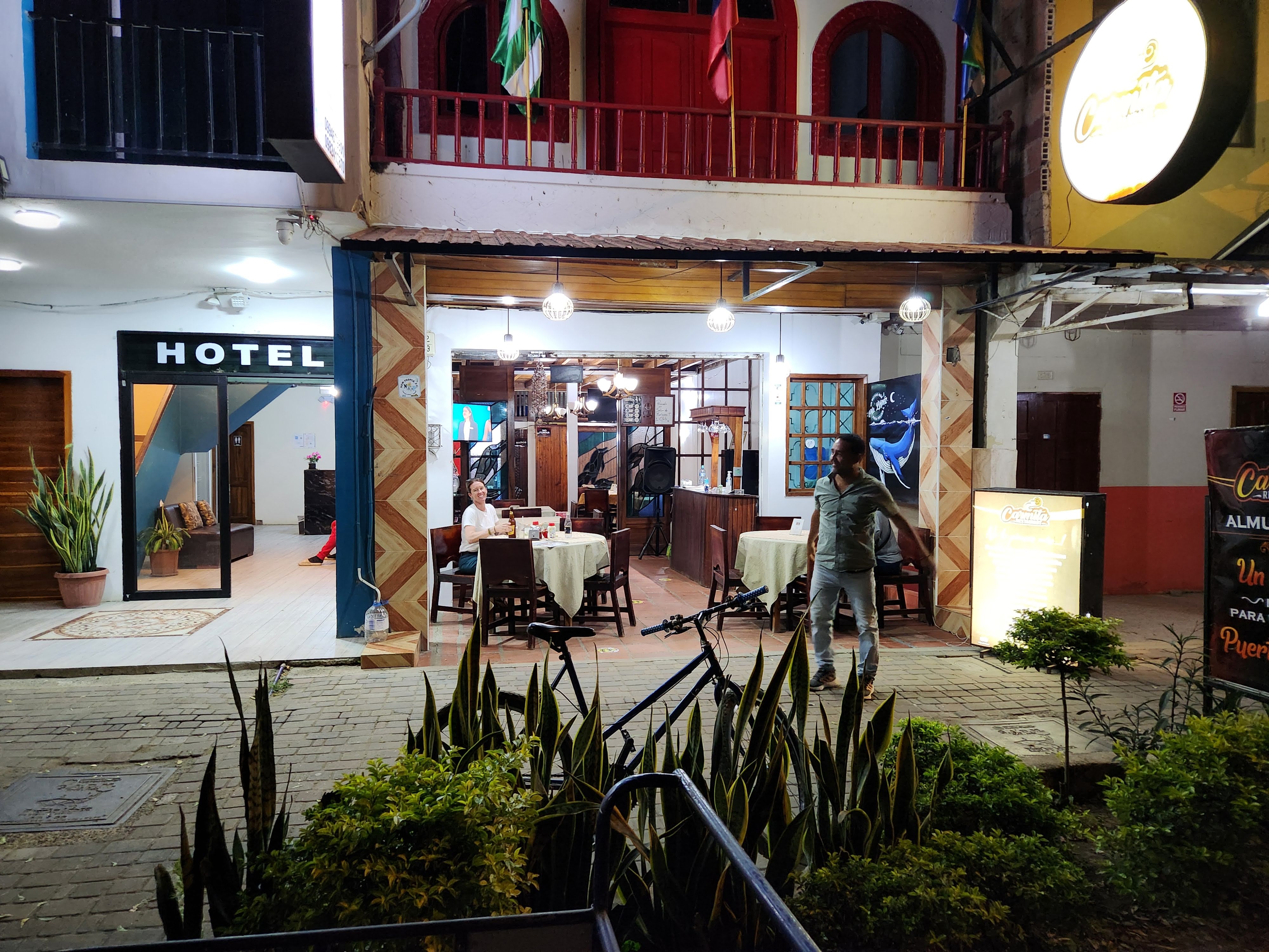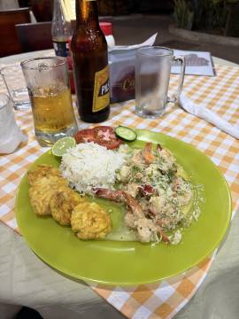 We soon found one of the recommended places, Carmita’s, and decided to give it a try. We were happy that there were no tacky neon lights and no loud bass thumping out of its building. We sat outside on the sidewalk and took in the sights as we ate a lovely meal. Scott was hooked on the fish after our Amazon trip, grilled this time, and I was happy with the coconut shrimp, which were broiled rather than fried as you normally see back home. Both came with savory fried plantain which was starting to grow on us. The server was attentive and he pointed out the restaurant’s owner and namesake, Carmita, another Ecuadorian abuela type, who was sitting with some friends nearby. We waved and indicated that we had found the meal to be quite enjoyable. The 15 minute walk back to the Hosteria Mandala was a perfect way to walk off the meal. We soon found ourselves back at the Pulpo and went to bed.